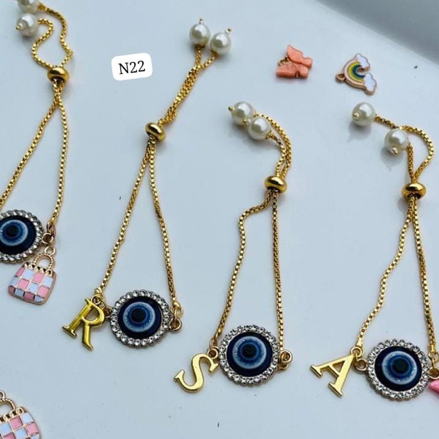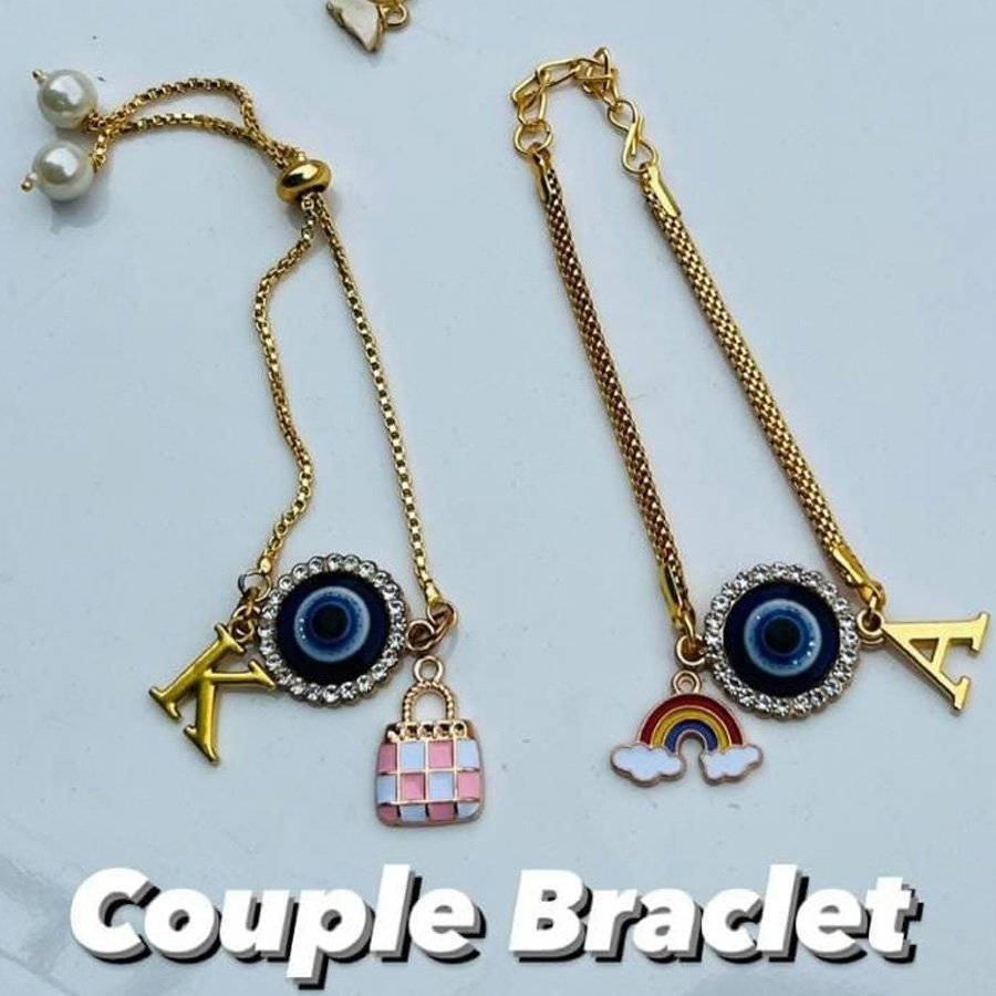 Celebrate love and protection with this charming Couple Evil Eye Bracelet Set. Each bracelet features a blue evil eye charm, known for warding off negativity, surrounded by sparkling stones. Customize your pair with gold-tone initial charms (like “A” and “K”) and cute enamel pendants – such as a pink handbag or a rainbow – adding a personal and playful touch.